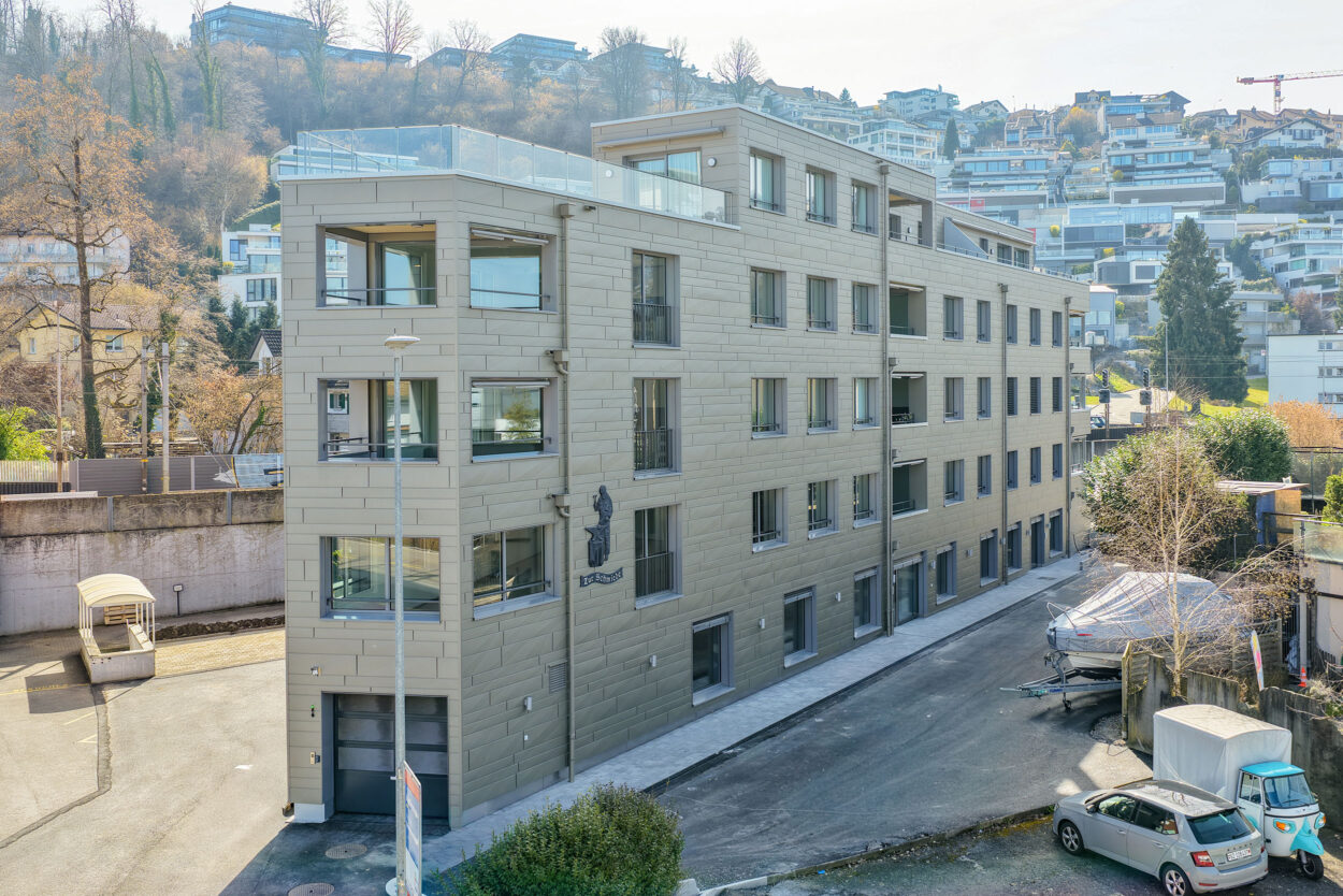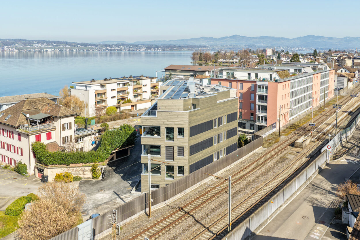 Der Neubau an zentraler Lage in Bäch ersetzte ein ehemaliges Restaurant sowie ein angrenzendes Wohn- und Gewerbegebäude aus den 50er- und 60er-Jahre des letzten Jahrhunderts. Der fünfgeschossige Holzelementbau wurde durch die Strüby Unternehmungen im Rahmen eines Gesamtleistungsauftrages entwickelt, geplant und umgesetzt. Das Objekt umfasst zehn moderne und komfortable Mietwohnungen mit 2.5 bis 5.5 Zimmern sowie zwei Gewerbelokale.