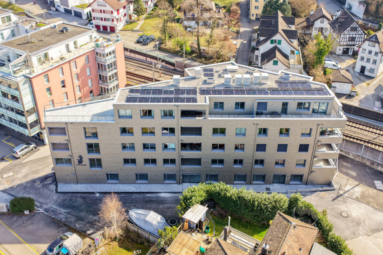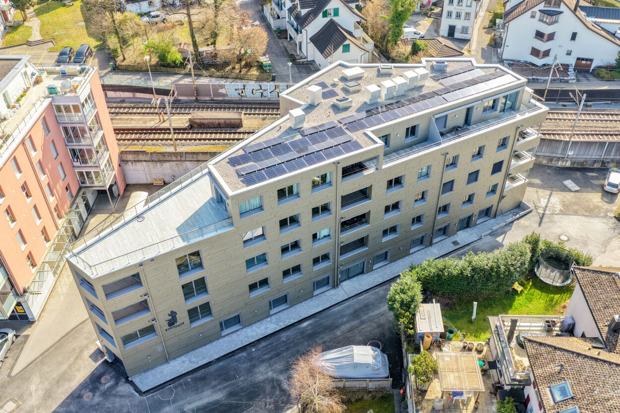 Fürs Heizen und zur Warmwasseraufbereitung wird eine effiziente Erdsonden-Wärmepumpe genutzt. Zudem deckt eine Photovoltaik-Anlage auf dem Dach und an der Fassade einen beachtlichen Teil des jährlichen Strombedarfs der Liegenschaft ab.