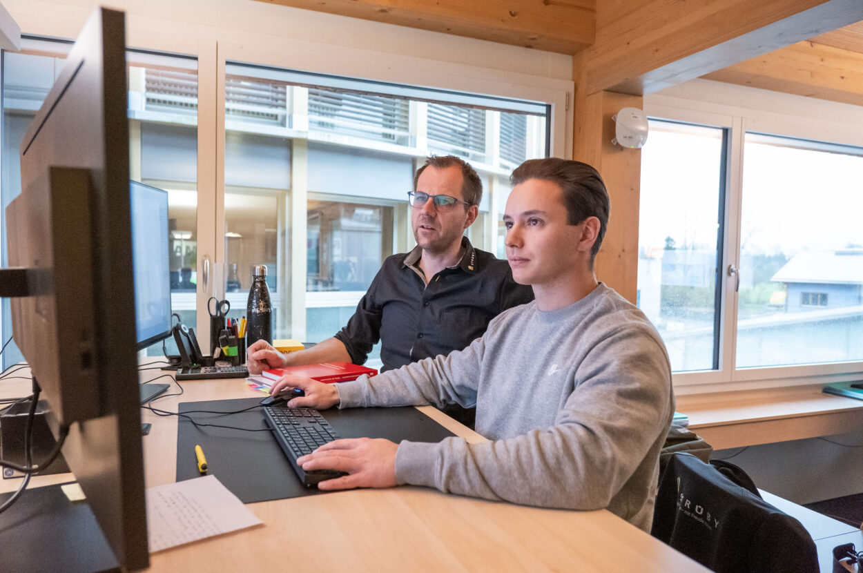 Les futurs ingénieurs en construction bois ont régulièrement l’occasion d’effectuer un stage dans les entreprises Strüby. C’est le cas de Sven Hübscher: il étudie la technique du bois avec spécialisation en construction en bois à la Haute école spécialisée de Bienne et a récemment commencé un programme d’initiation intensif chez Strüby sous l’aile du responsable de l’ingénierie, Beat Kenel. Sven Hübscher apprécie particulièrement le fait que toutes les disciplines pertinentes soient réunies sous un même toit, ce qui lui permet de trouver rapidement un soutien spécialisé en cas de besoin. Pendant son stage d’environ neuf mois, il réalisera un outre son travail de bachelor. Pour cela, les entreprises Strüby lui souhaitent d’ores et déjà beaucoup de succès et se réjouissent de la collaboration à venir.