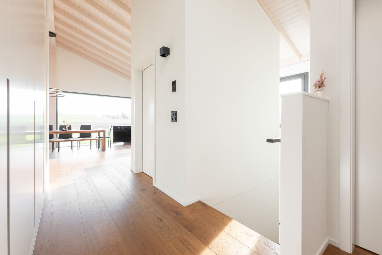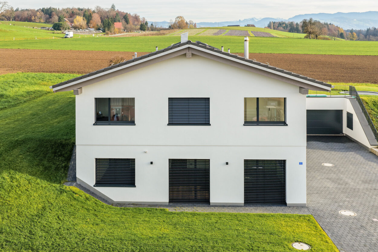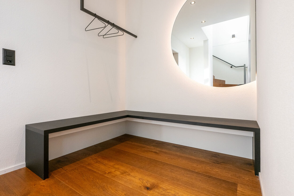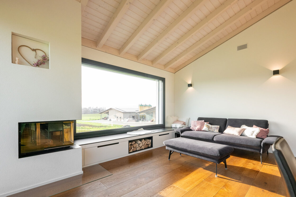 La reconstruction d’une maison individuelle datant des années 1970 comprend un appartement moderne de 5,5 pièces. Le bâtiment est situé en dehors de la zone à bâtir et a été réalisé en environ un an. Lors de la planification et de la réalisation, le maître d’ouvrage a pu bénéficier du savoir-faire complet et de la longue expérience de Strüby dans la construction de logements et de bâtiments agricoles. Les portes, les meubles de salle de bains, les penderies, les banquettes et les placards ont également été fabriqués par Strüby dans son propre atelier de menuiserie.