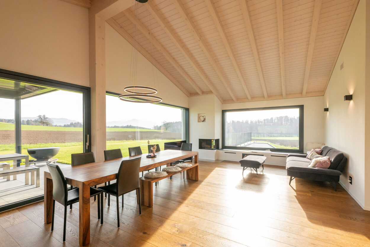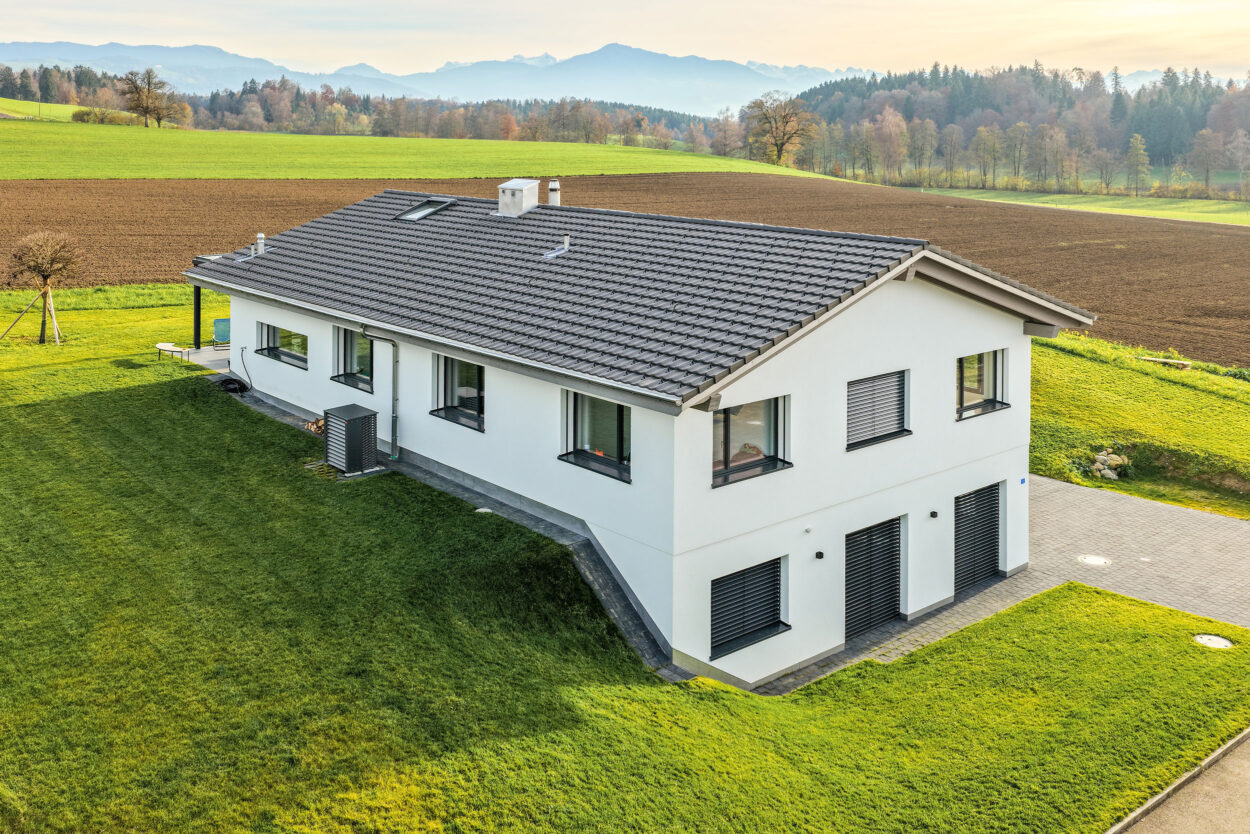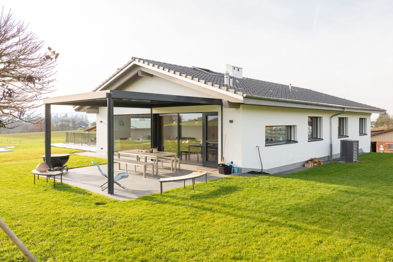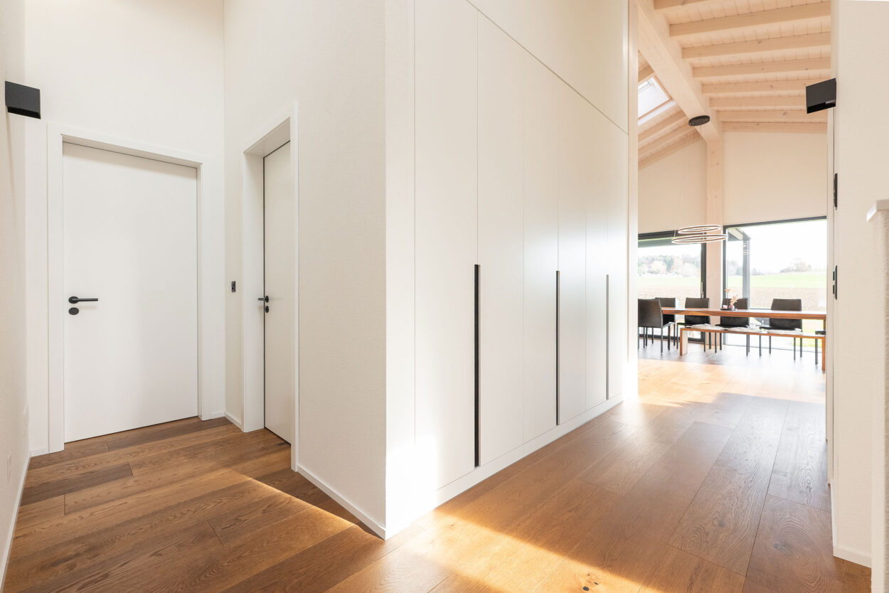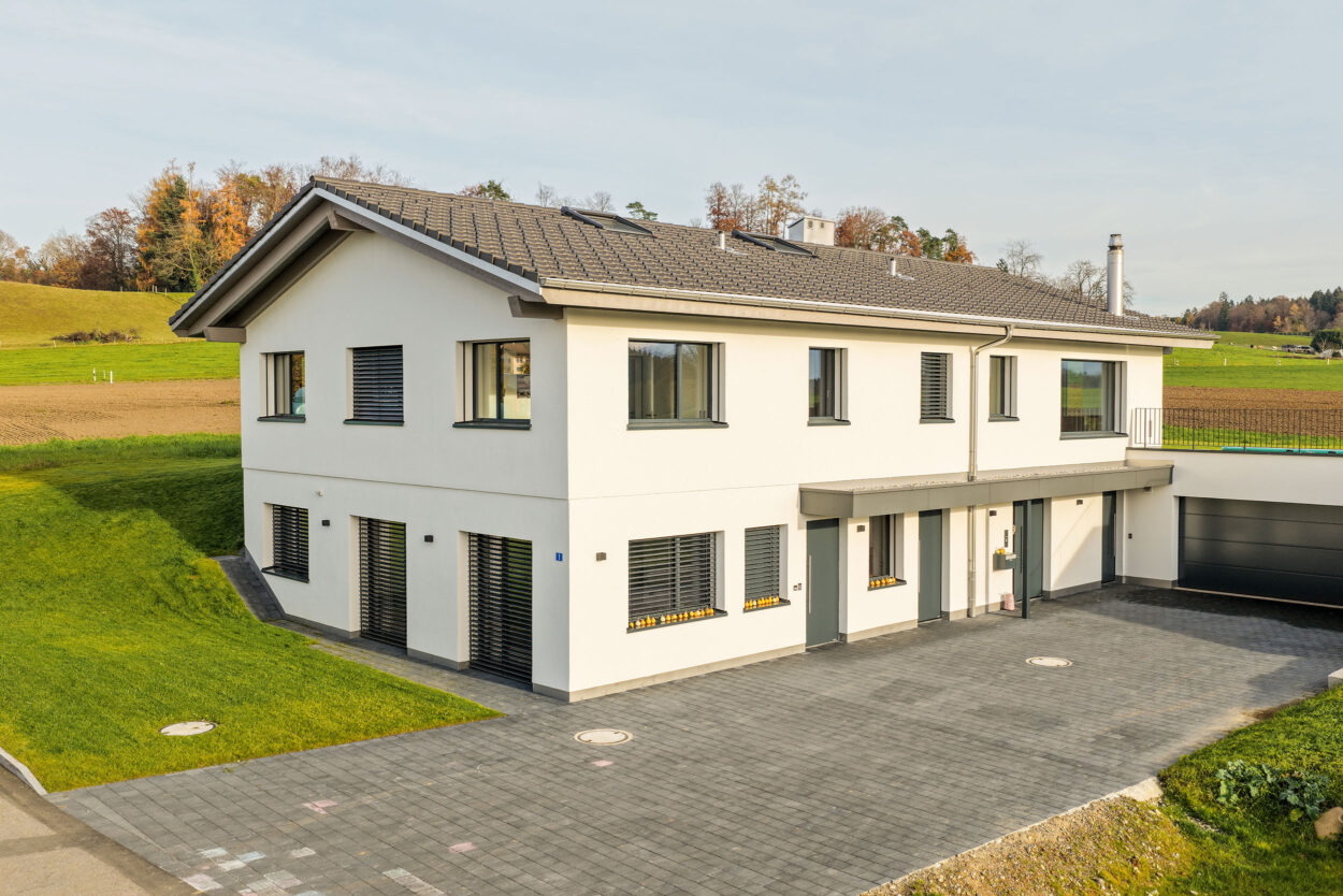 La reconstruction d’une maison individuelle datant des années 1970 comprend un appartement moderne de 5,5 pièces. Le bâtiment est situé en dehors de la zone à bâtir et a été réalisé en environ un an. Lors de la planification et de la réalisation, le maître d’ouvrage a pu bénéficier du savoir-faire complet et de la longue expérience de Strüby dans la construction de logements et de bâtiments agricoles. Les portes, les meubles de salle de bains, les penderies, les banquettes et les placards ont également été fabriqués par Strüby dans son propre atelier de menuiserie.