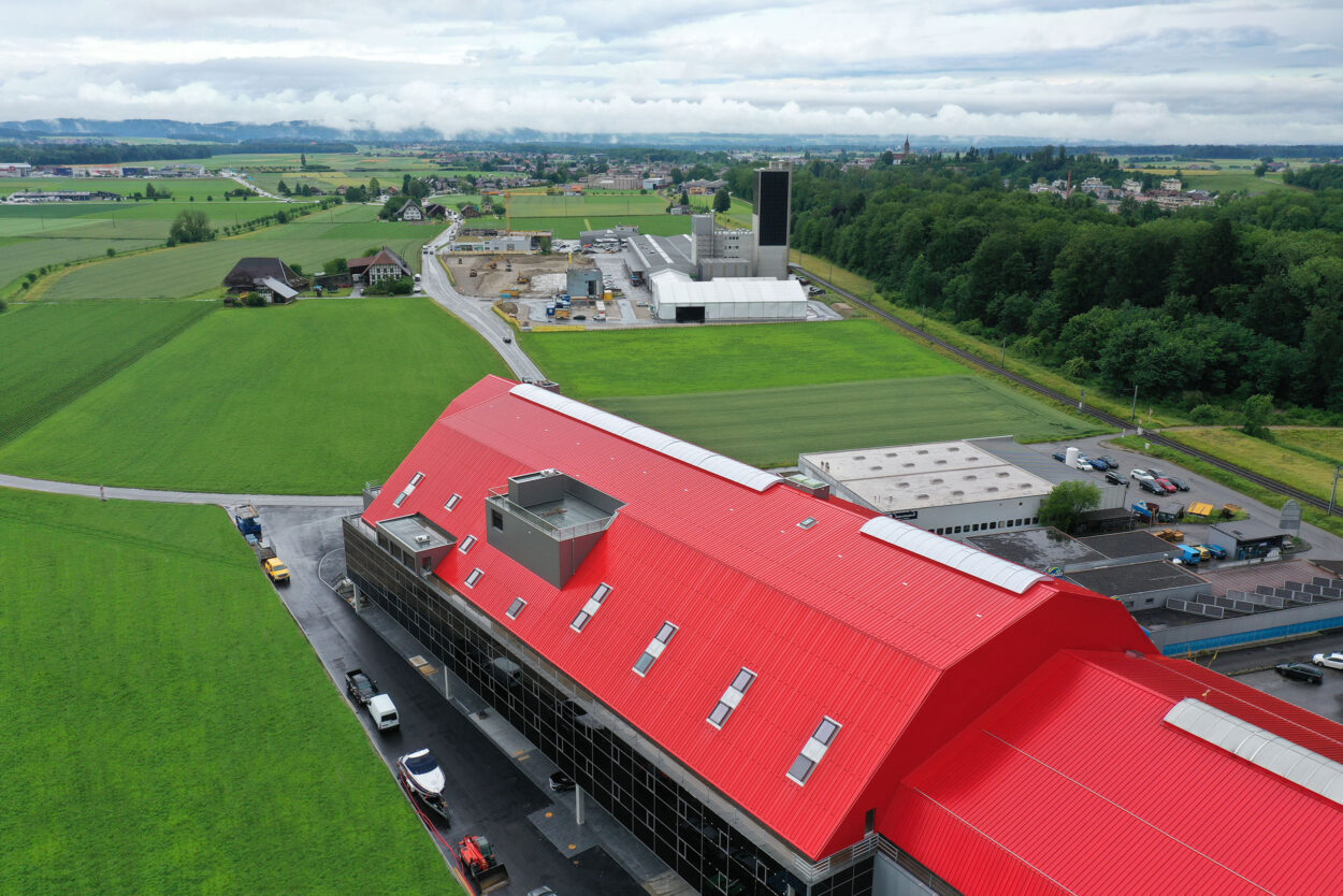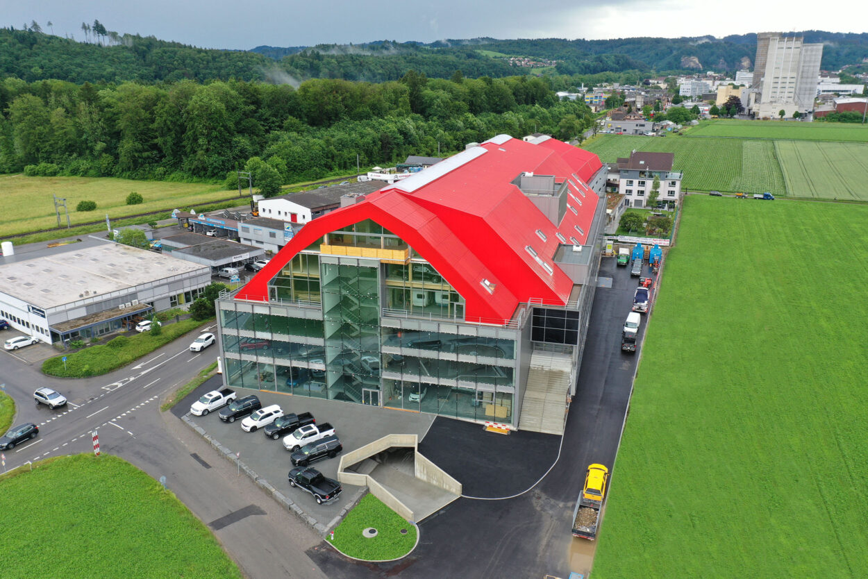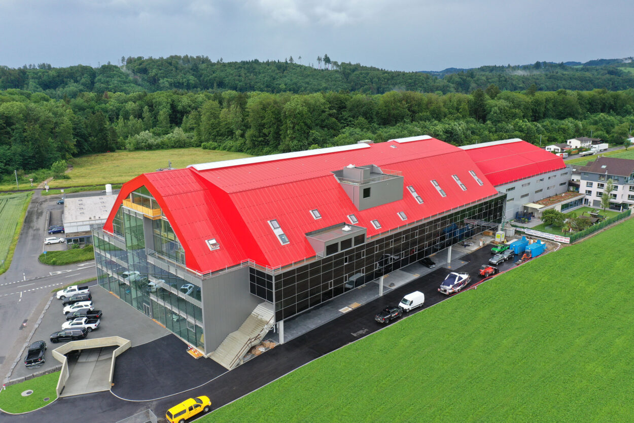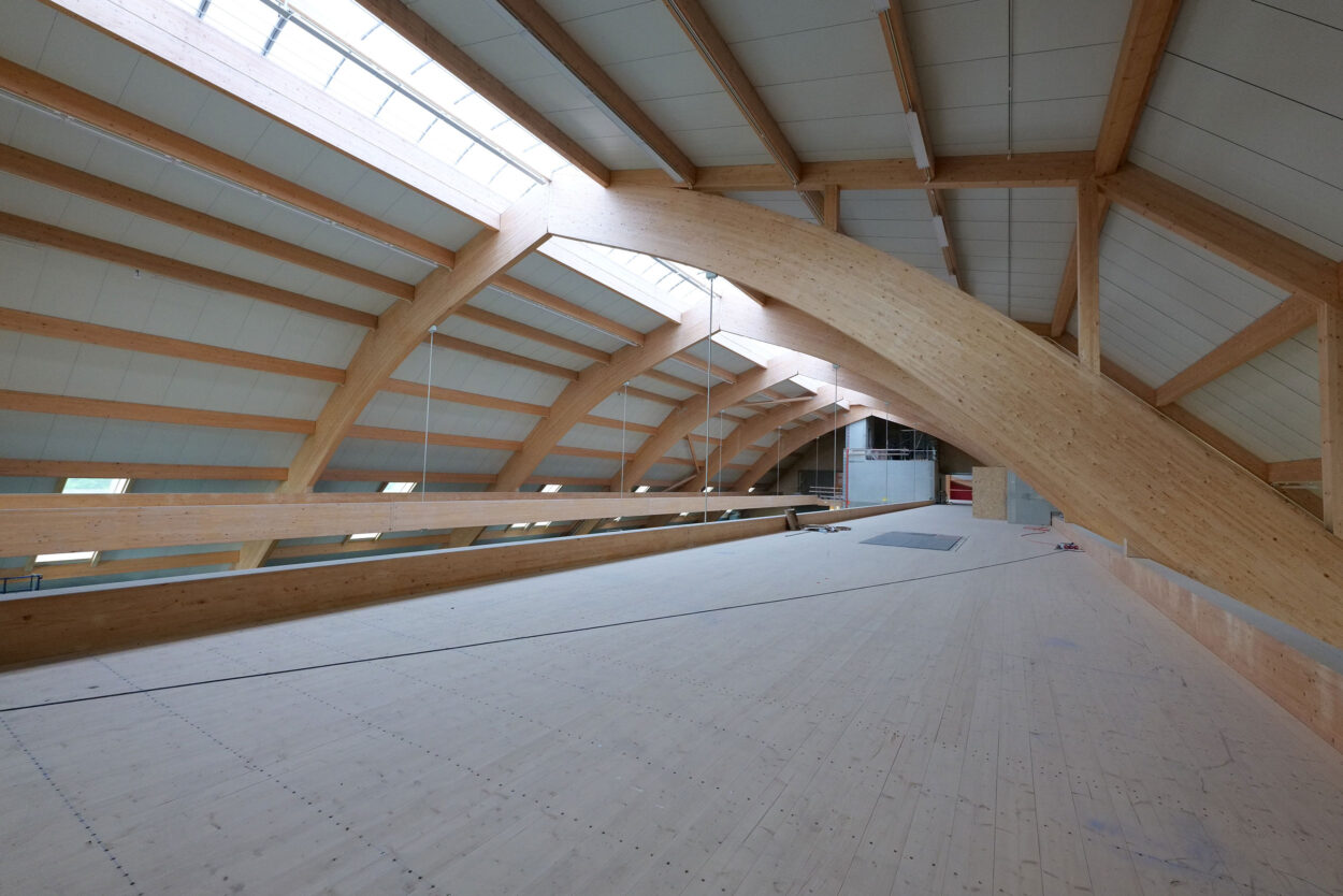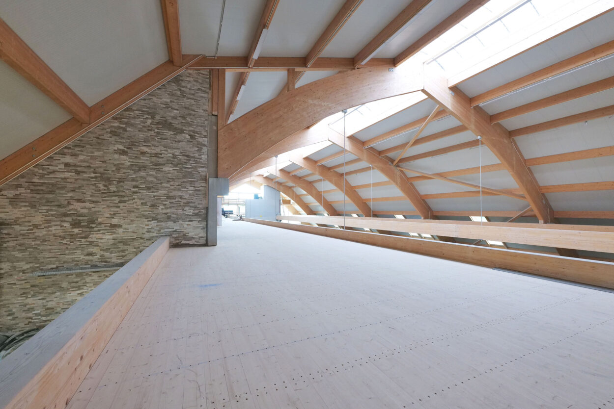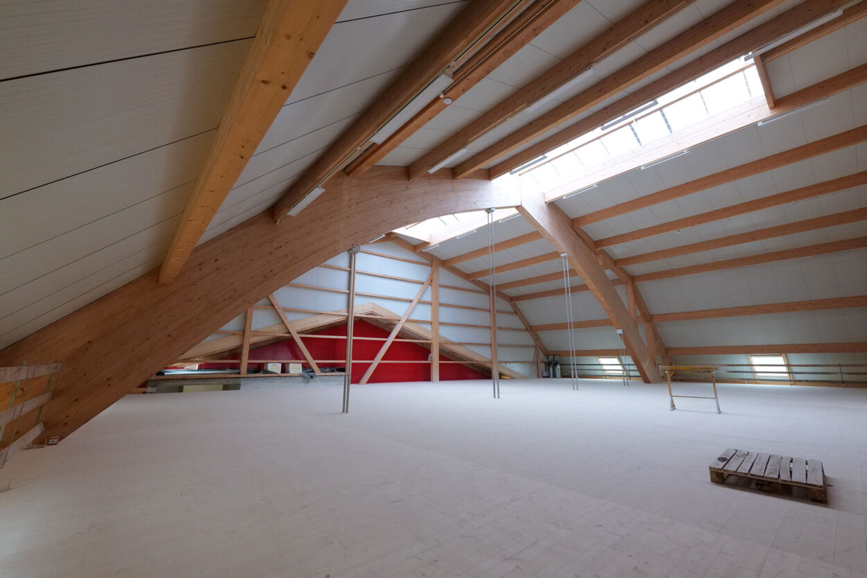 Im Rahmen eines Anbaus an eine bestehende Gewerbehalle wurde durch das Strüby Holzbau-Team dieses imposante Dach- und Galeriegeschoss erstellt. Die stützenfreie Konstruktion aus Schweizer Holz weist Aussenmasse von rund 46 mal 90 m auf. Dabei wird eine Spannweite von 40 m und eine Innenhöhe von knapp 14 m erreicht.