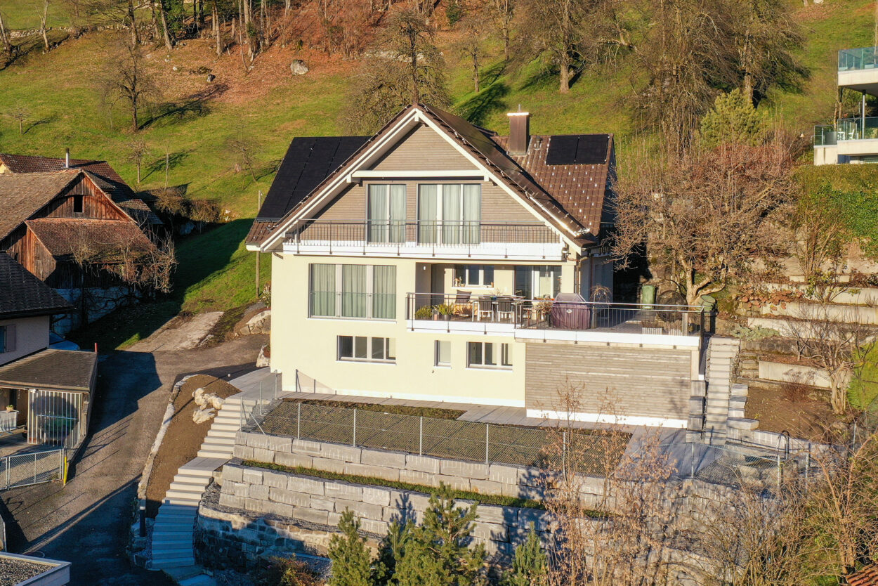 Im Rahmen eines Gesamtleistungsauftrags konnte dieses Einfamilienhaus mit Einliegerwohnung in Schwyz SZ vollständig saniert werden. Das dreistöckige Gebäude mit einer Wohnfläche von rund 262 m² wurde mit einer Photovoltaikanlage auf dem Dach ausgestattet. Die Küchen, Einbauschränke, Garderoben, Badmöbel, Türen und Treppen wurden von der hauseigenen Schreinerei gefertigt.