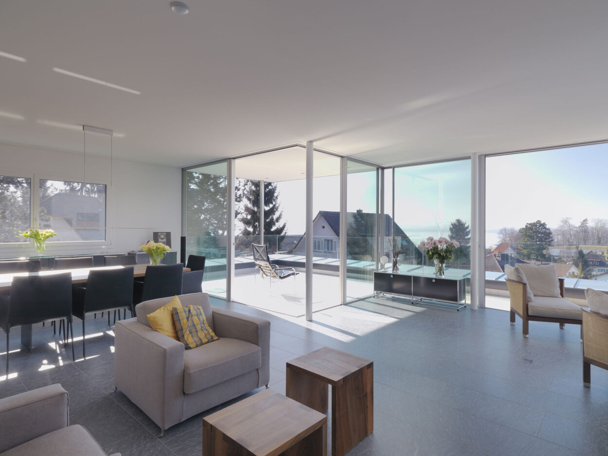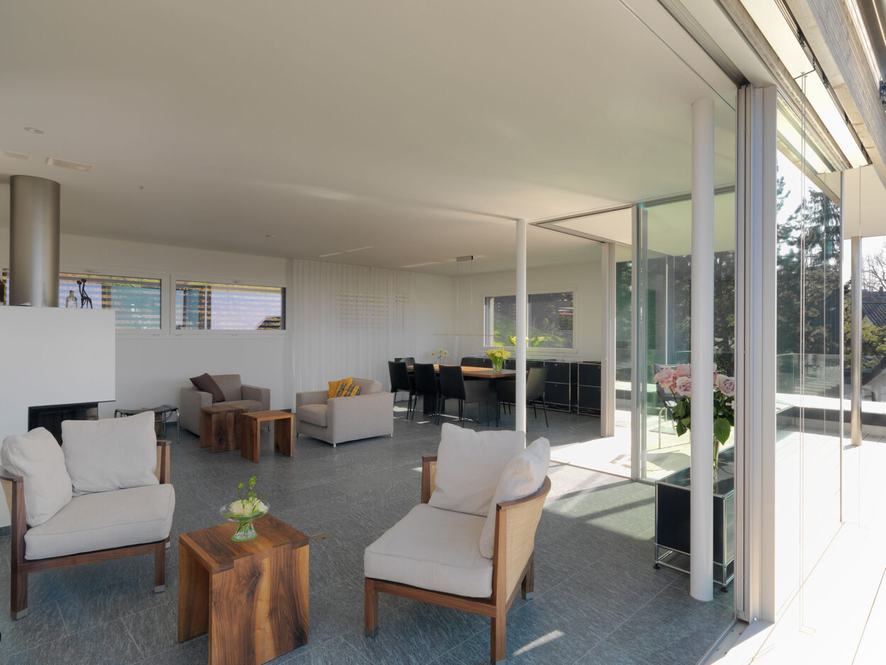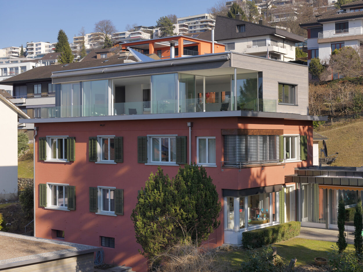 Anstelle des bestehenden Dachgeschosses wurde ein neues Attikageschoss mit modernen Raumhöhen und raumhohen Fensterfronten realisiert. Dadurch entstanden lichtdurchflutete Räume, welche einen sehr hohen Wohlfühlfaktor aufweisen. Durch punktuelle Anpassungen in den unteren Geschossen stehen für die Bewohner zwei hochwertige Wohnungen zur Verfügung. Mehr Komfort und somit mehr Wohnqualität sind garantiert.
