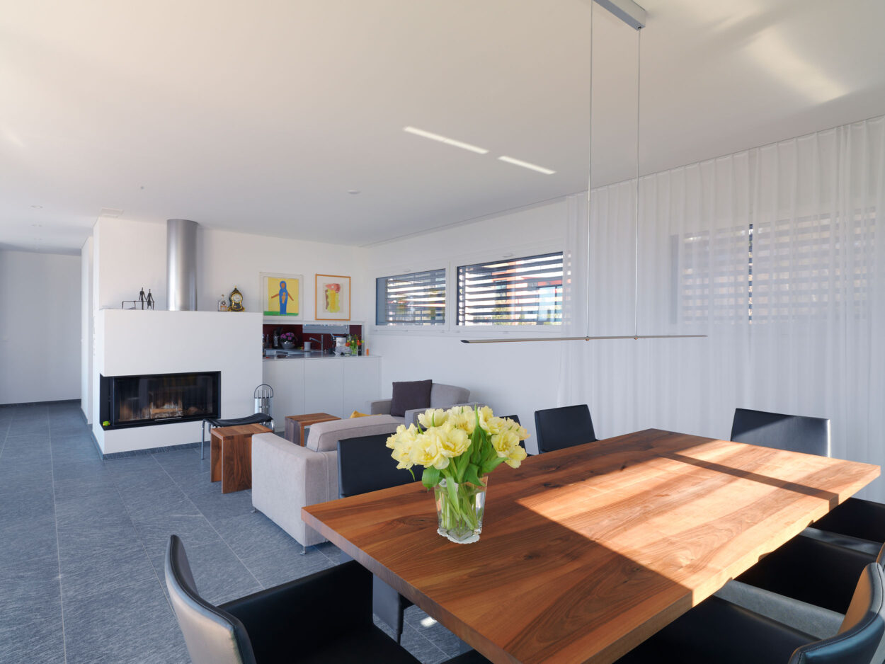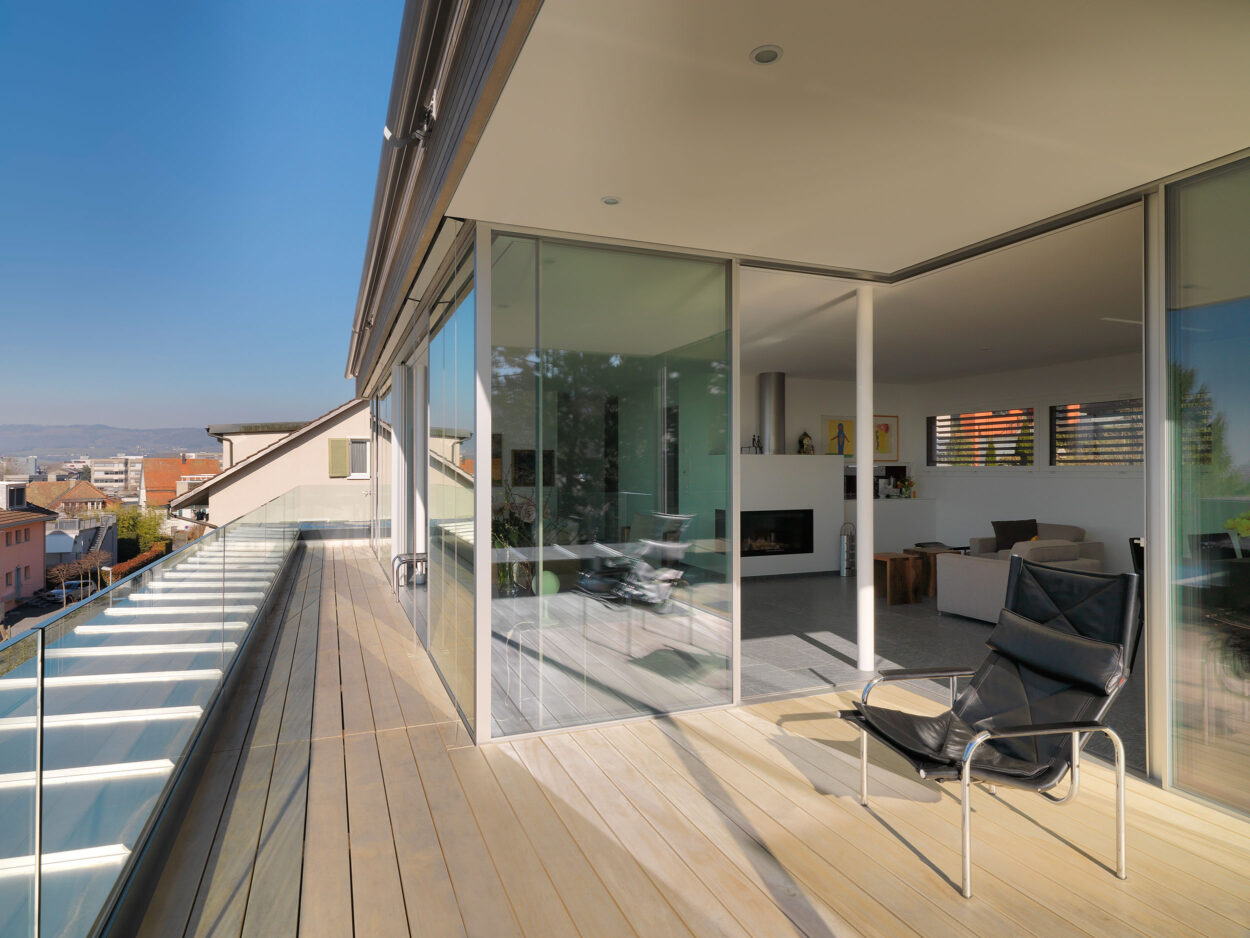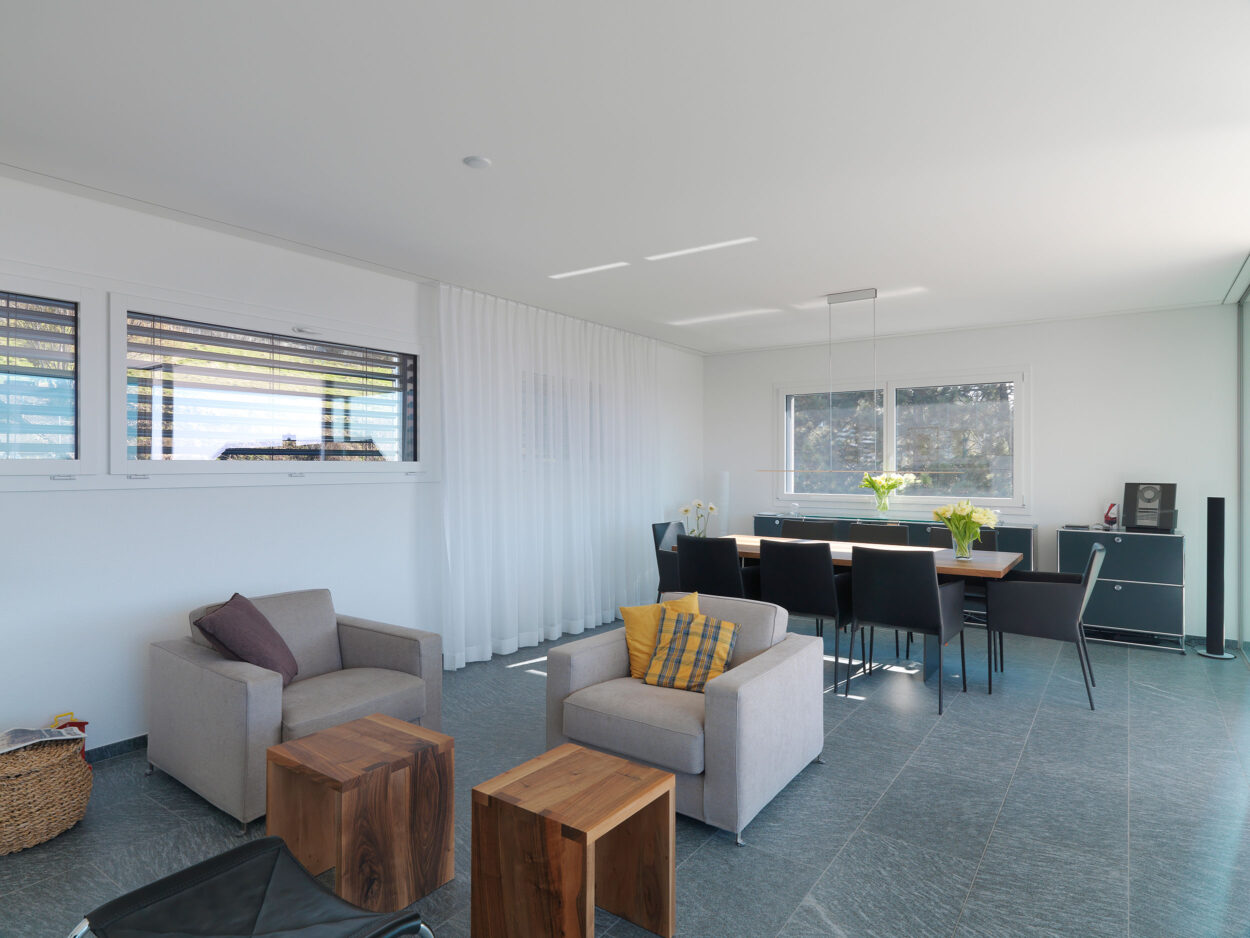 Anstelle des bestehenden Dachgeschosses wurde ein neues Attikageschoss mit modernen Raumhöhen und raumhohen Fensterfronten realisiert. Dadurch entstanden lichtdurchflutete Räume, welche einen sehr hohen Wohlfühlfaktor aufweisen. Durch punktuelle Anpassungen in den unteren Geschossen stehen für die Bewohner zwei hochwertige Wohnungen zur Verfügung. Mehr Komfort und somit mehr Wohnqualität sind garantiert.