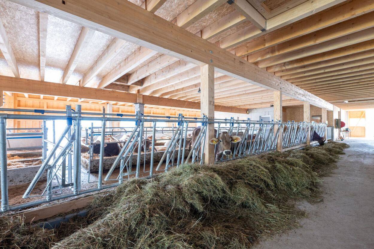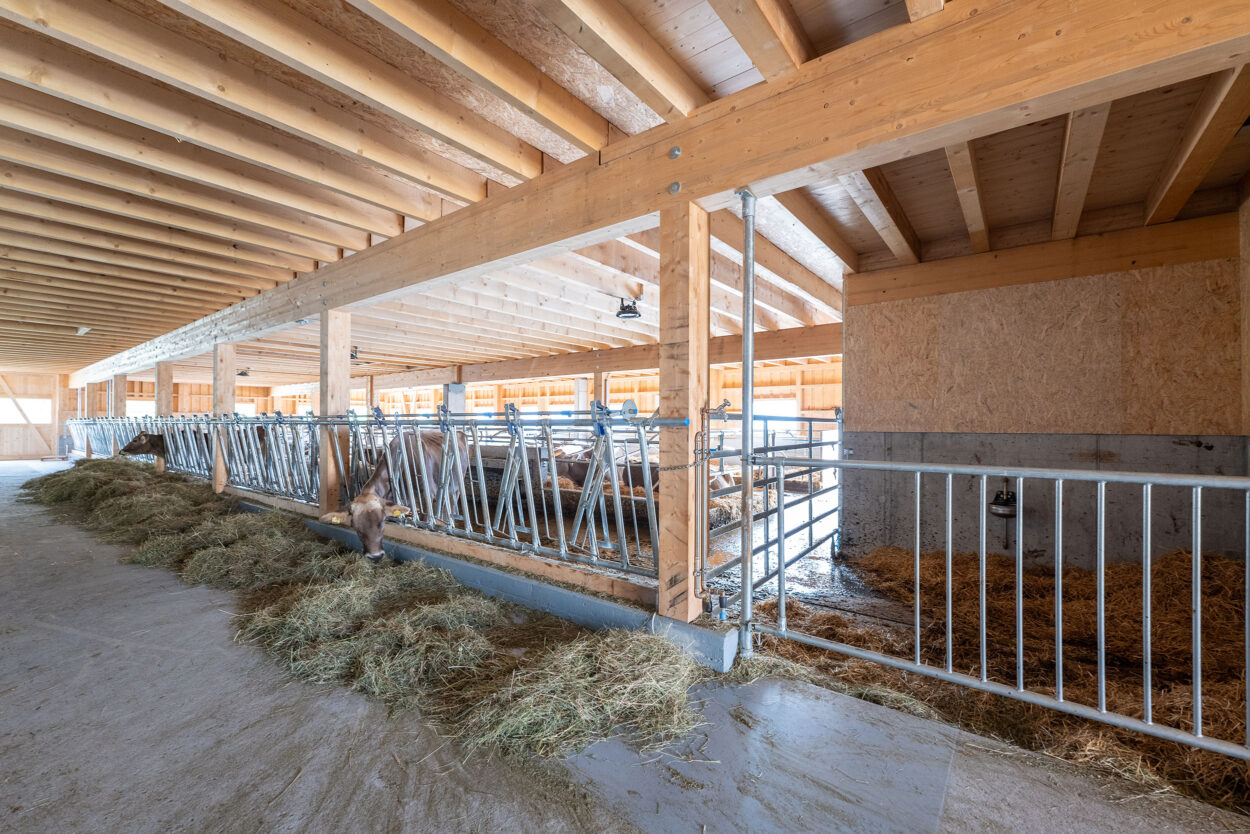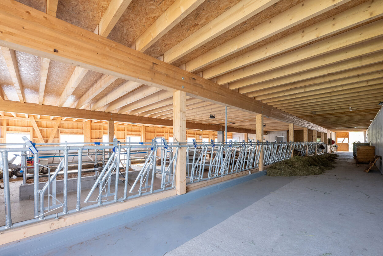 Der Bau dieses Milchviehstalls wurde im Rahmen einer Gesamtleistung realisiert. Der Neubau misst rund 37 mal 16 m, bietet 46 Tieren Platz und verfügt im Obergeschoss unter anderem über ein 1481 m² grosses Futterlager.