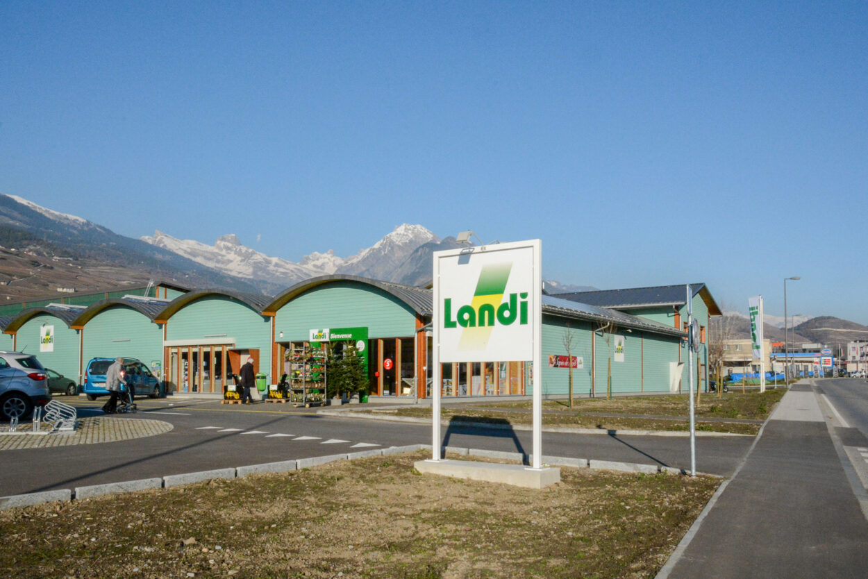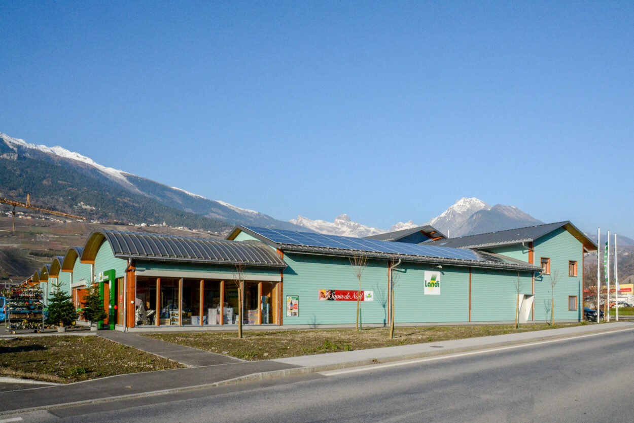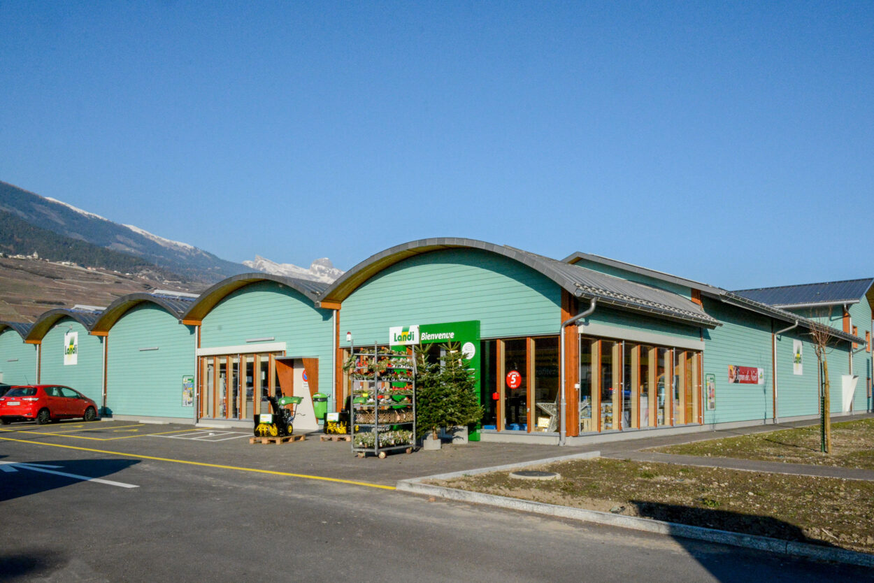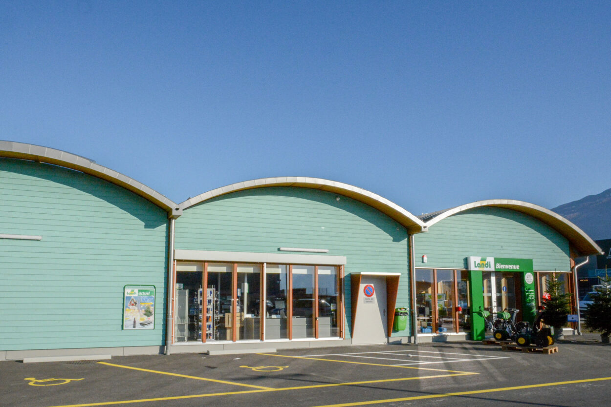 In Conthey hatten wir das Vergnügen, diese neue Verkaufsstelle nach rund achtmonatiger Bauzeit an den Bauherrn LANDI Chablais-Lavaux SA zu übergeben. Das Gebäude, für dessen Bau 378 m³ Schweizer Holz verwendet wurde, verfügt über eine Verkaufsfläche von rund 1800 m² und einLager von rund 330 m². Ein spezielles Belüftungssystem über das Dach sorgt für eine gute Luftqualität im gesamten Laden.