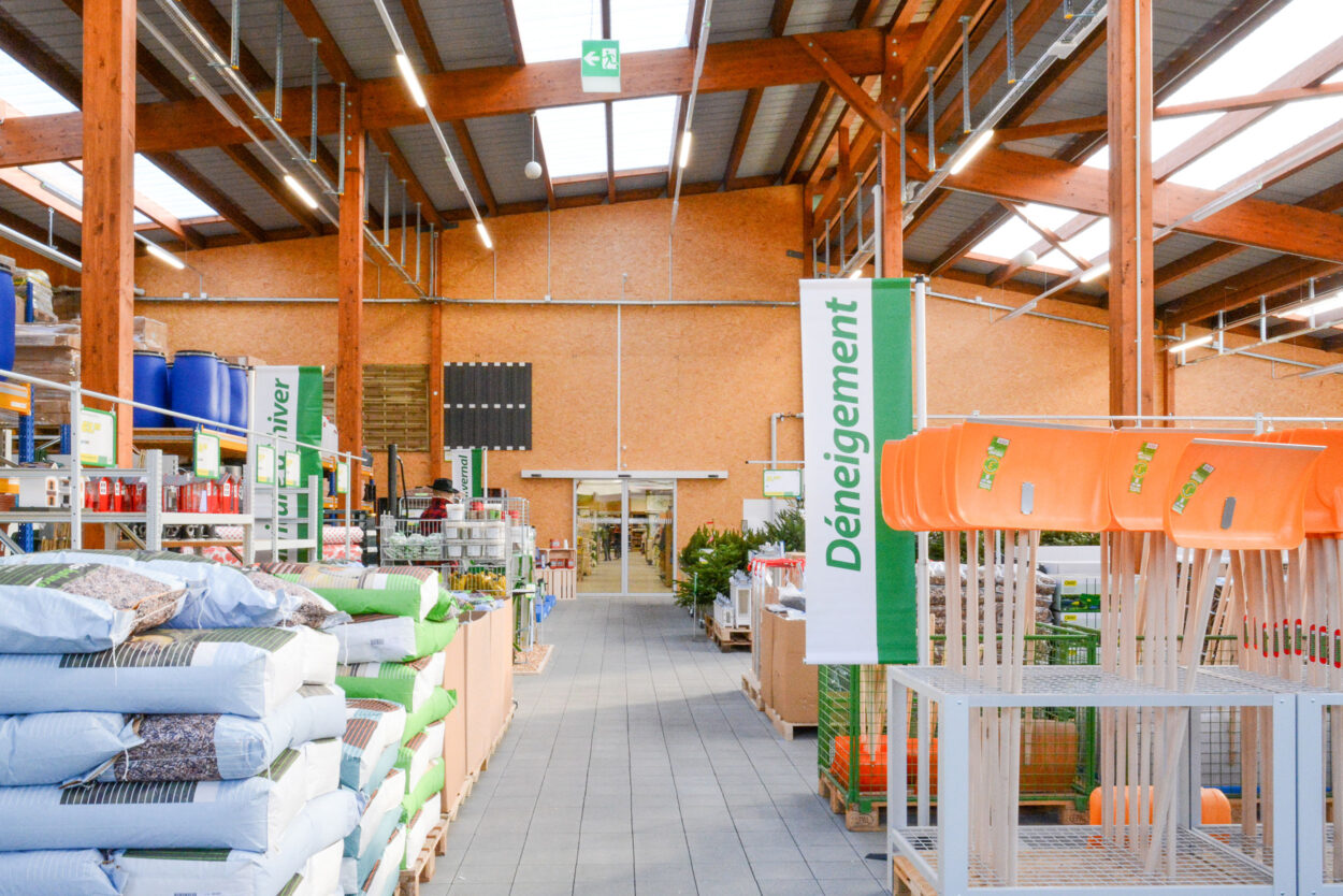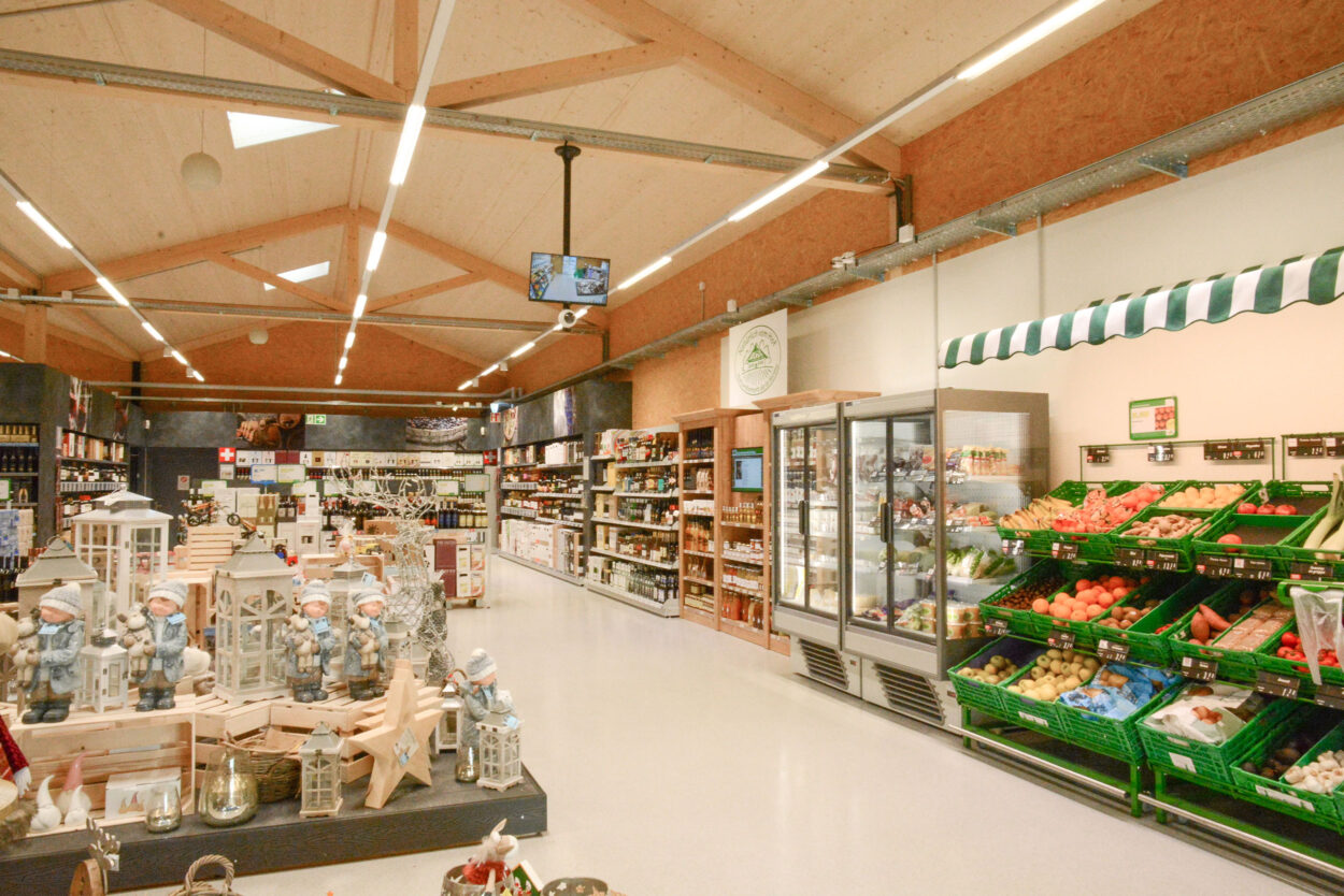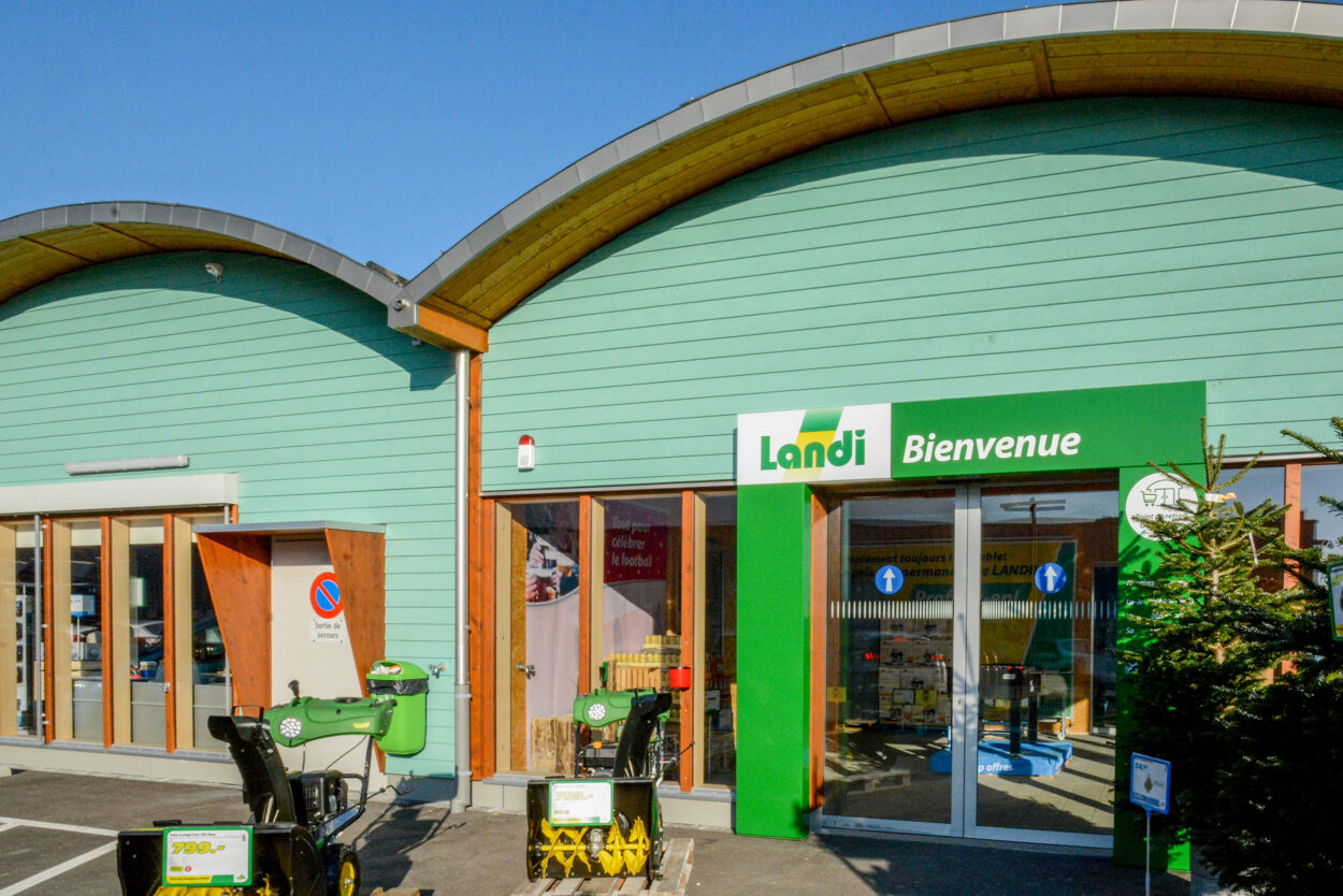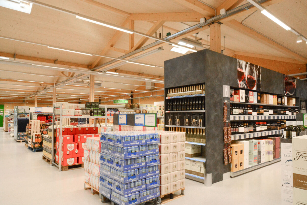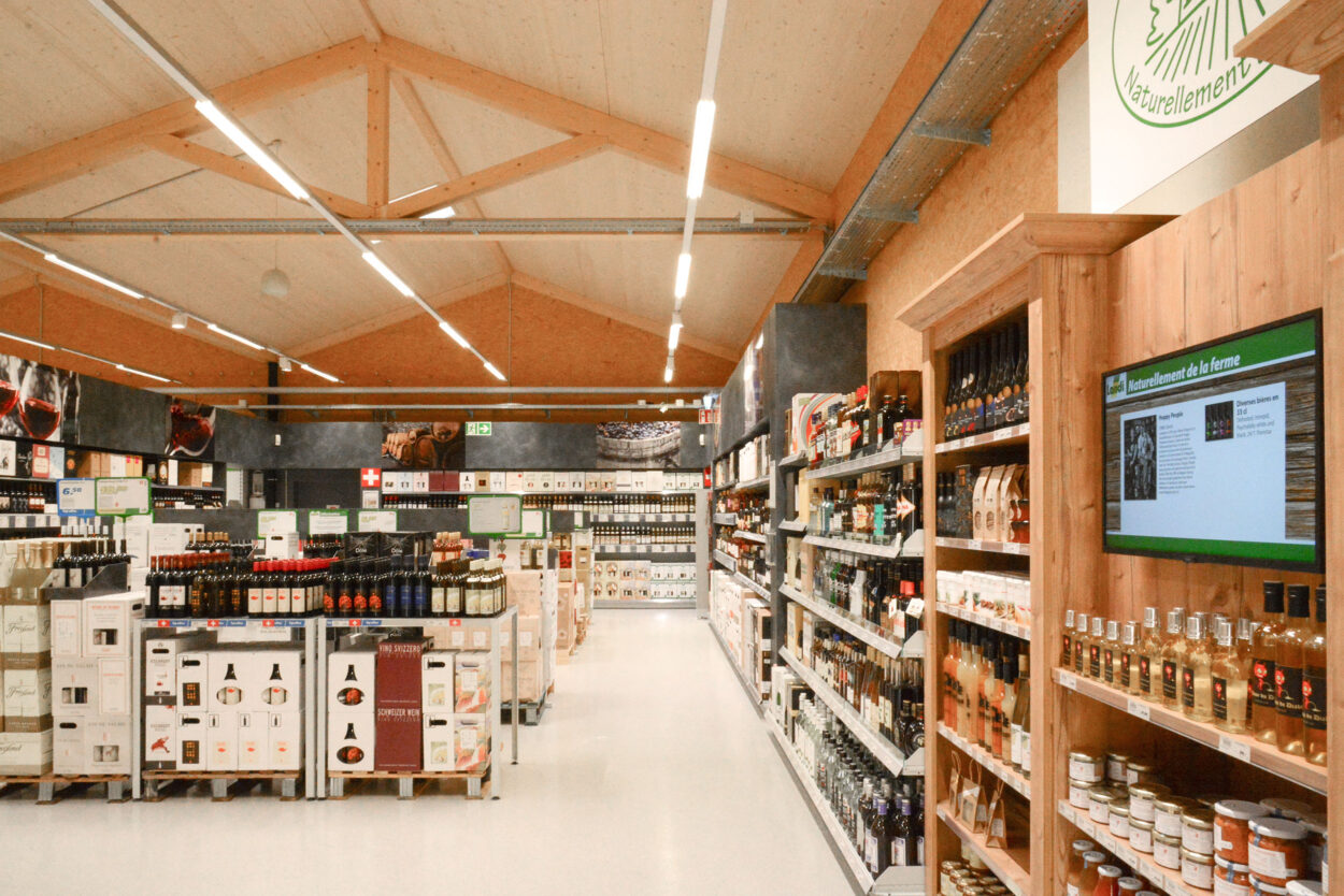 In Conthey hatten wir das Vergnügen, diese neue Verkaufsstelle nach rund achtmonatiger Bauzeit an den Bauherrn LANDI Chablais-Lavaux SA zu übergeben. Das Gebäude, für dessen Bau 378 m³ Schweizer Holz verwendet wurde, verfügt über eine Verkaufsfläche von rund 1800 m² und einLager von rund 330 m². Ein spezielles Belüftungssystem über das Dach sorgt für eine gute Luftqualität im gesamten Laden.